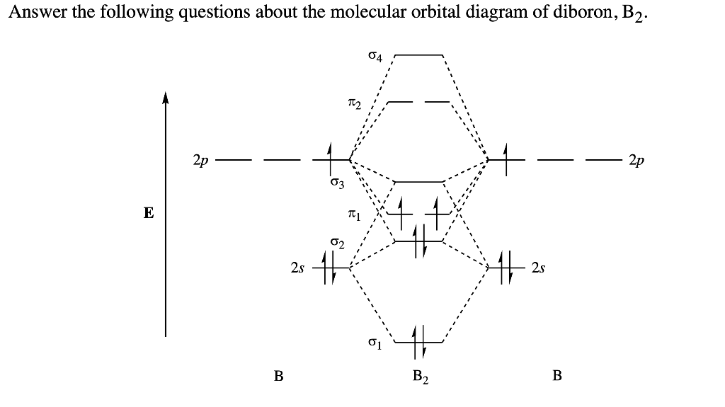 "BO" = 1/2 Boron atom is atomic number 5 in the periodic table, so it has five electrons. Thus, B_2 carries ten total electrons. The atomic orbitals each boron contributes consists of the 1s, 2s, and 2p. The ns orbitals combine to give a portion of the molecular orbital (MO) diagram like this: where sigma^"*" indicates an antibonding sigma (sigma) MO, and sigma is the bonding MO. Use MO diagrams to place B2+, B2, and B2- in order of (a) decreasing bond energy; (b) decreasing bond length. Explanation. The electron configuration of . B B B. atom is . 1 s 2 2 s 2 2 p 1 1s^2 \\ 2s^2 \\ 2p^1 1 s 2 2 s 2 2 p 1. At first, build the molecular orbital diagram for .