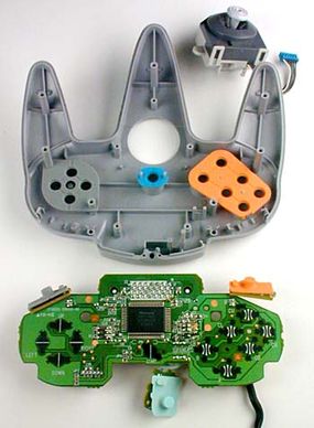 The N64 controller uses only three wires to connect to the console. There's a ground wire, another wire that supplies +3, 6 volts of power, and a third wire that carries all data. The controller sends the information for each button in sequence, and then receives data back from the console. Advertisement.