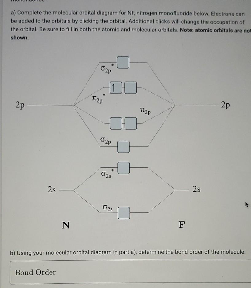 Presented diagram shows how the atomic orbitals of two N atoms combine to form molecular orbitals of nitrogen molecule: each nitrogen atom has three one-occupued p-orbitals and when the atoms interact they produce three bonding molecular orbitals of nitrigen molecule - one of sigma-type(symmetry) ... So, it will have some net magnetic moment. Atomic number of nitrogen is seven. Therefore in ${N_2}$ there are a total fourteen electrons. But $N_2^ - $ has one electron more than that of nitrogen molecule. So, total electrons are fifteen. Molecular orbital diagram of $N_2^ - $ is shown below: The nitrogen atom is less electronegative than the oxygen atoms so its atomic orbitals are a little higher in energy. By Hund's rule, the electron configuration of carbon, which is 1s 2 2s 2 2p 2, is understood to correspond to the orbital diagram shown in c. Experimentally, it is found that the ground state of a neutral carbon atom does indeed contain two unpaired electrons. Draw an orbital diagram for nitrogen, Z = 7. ১০ ফেব, ২০২১