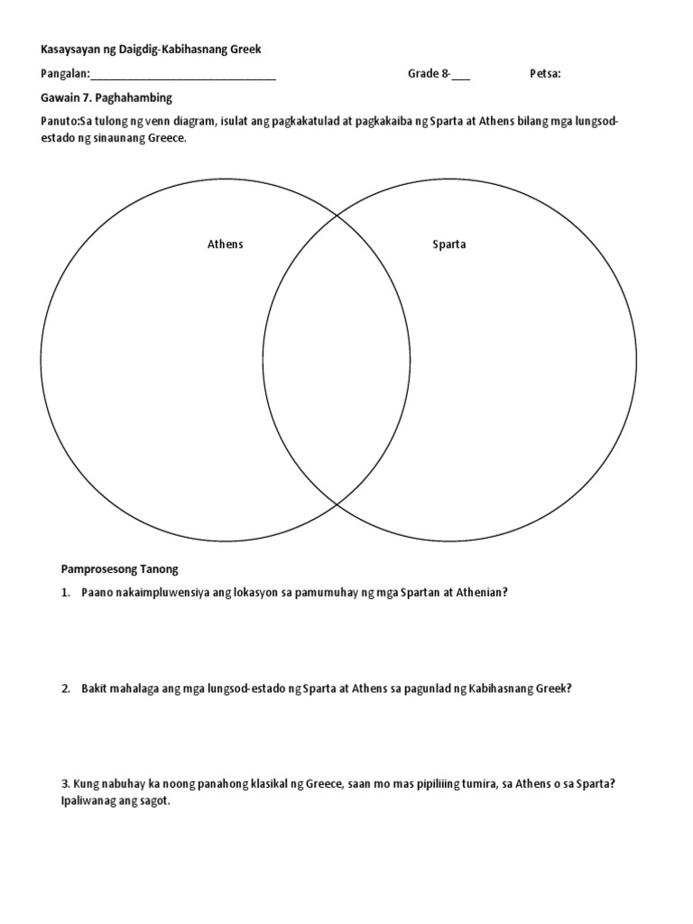 Creately diagrams can be exported and added to Word, PPT (powerpoint), Excel, Visio or any other. 2 Activity Read pages of your textbook. Athens vs. Sparta ( Venn Diagram) Create a Venn Diagram to compare Sparta and Athens Things to compare: 1. Location 2. Attitude towards trade. Sparta vs. Athens Webquest women characters.