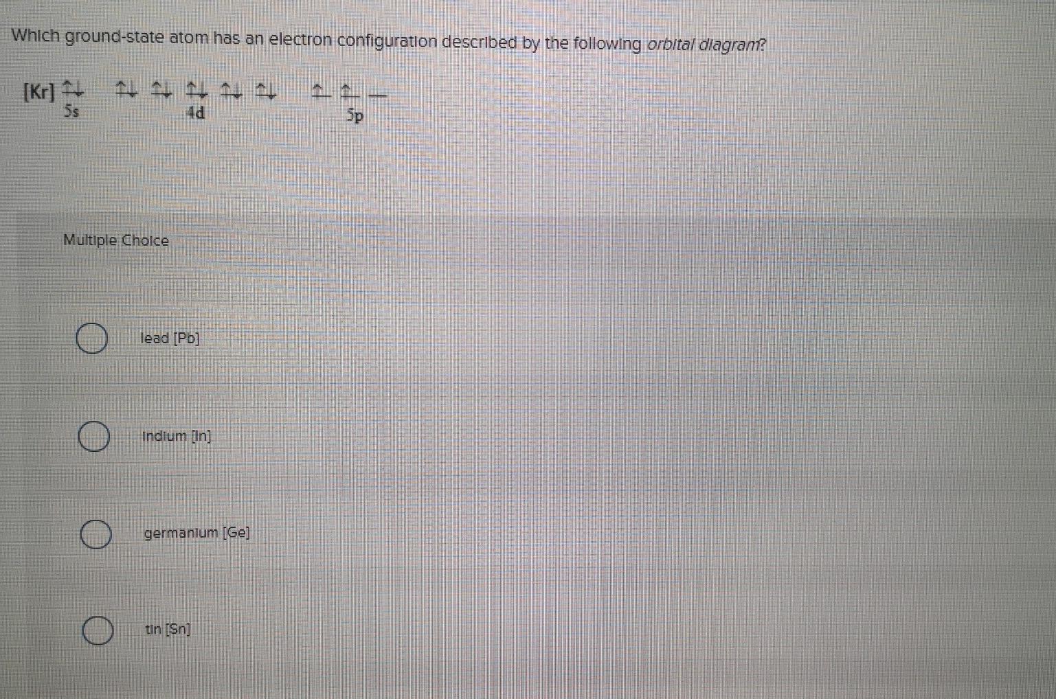 Answer (1 of 2): First of all, I hate when this happens! Your teacher is actually wrong. The electron configuration of Ge2+ is [Ar] 4s2 3d10 Below I drew out exactly what will happen when you remove (+2) 2 electrons from the Germanium ion (Ge). If you want to use a noble gas to configure an ion,...