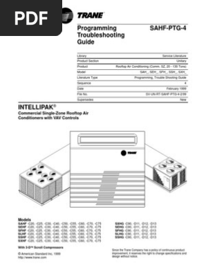 Intellipak Ii Commercial Single Zone Rooftop Air Conditioners With Cv Vav Szvav Or Rr Controls Installation Operation Main. Intellipak 2 trane installation operation rt svx36p en svx10h 03012009 manualzz figure 5 1 wiring diagram signature series modular unit diagrams ii commercial single zone and maintenance self contained rooftop air i iom diagnostic manual svx10c 90 to 162 tons 20 110 ... 99 Unit Wiring Diagram Numbers Compressor Oil. Figure Refer to the unit wiring diagrams. Cooling Only 40 ton. ... Read and download Trane Rooftop Systems Voyager Commercial to 50 Tons Installation and Maintenance Manual | Page online. Download free Trane user manuals, owners manuals, instructions, warranties and installation guides, etc. Wiring ... Unit Wiring Diagram Numbers. Trane Gas Fired Rooftop Air Conditioners. Model YCD YCH to Installation, Operation, and Maintenance. Trane reserves the right to revise this field wiring installation and grounding as described in. NEC and your .. YCD, YCH, YSC and YHC (Parts Only) involved. Refer to the unit's wiring diagrams for proper.