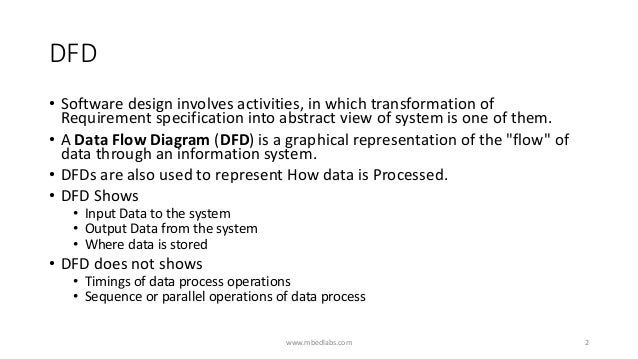 A Data Flow Diagram (DFD) is a graphical representation of the "flow" of data through an information system (as shown on the Often it is a preliminary step used to create an overview of the system that can later be elaborated. DFDs can also be used for the visualization of data processing (structured...