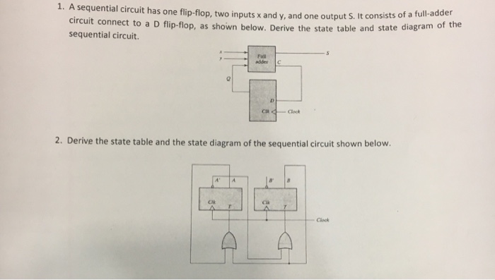 (12 Points) For the sequential circuit in Figure 3, derive the state table and the state diagram. Note that for this circuit the outputs are 𝑄 ? and 𝑄 ? Figure 3 – Modulo-3 counter This is a Moore machine because the output is the present state values. A sequential circuit has one flip-flop Q, two inputs x and y, and one output S. It consists of a full-adder circuit connected to a D flip-flop, as shown. Derive the state table and state diagram of the sequential circuit. Solution: FA Q Q SET CLR D X Y S C CLK On this channel you can get education and knowledge for general issues and topics 4. Derive the state table and the state diagram of the sequential circuit shown below. Obtain the output and state sequence with the input sequence: 0110111010. 21 D ) D Q 21 y2 V2: te qe clk 22 ; Question: 4. Derive the state table and the state diagram of the sequential circuit shown below.