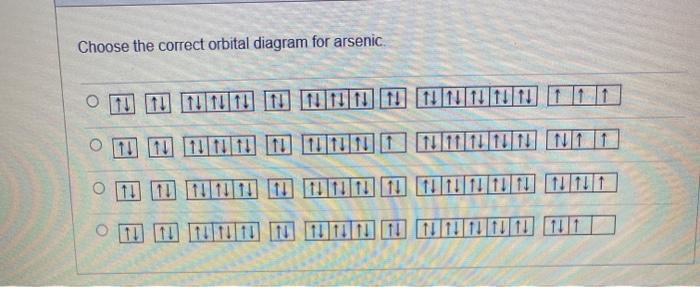 Complete the orbital diagram for arsenic. Arsenic (As) has an atomic mass of 33. Find out about its chemical and physical properties, states, energy, electrons, oxidation and more. Orbital Diagram. 1s. ↿⇂. 3d 1000 Answer Bank Energ. Construct the orbital diagram for arsenic. What kind of feedback would you provide - select from the list below (you may select more than one answer). a. Orbital diagram obeys the Aufbau principle. b.The noble gas chosen for... 8 - Write the valence orbital diagram for the ground... Ch. 8 - Match each set of characteristics on the left with... 8 - The following are orbital diagrams for presumed...