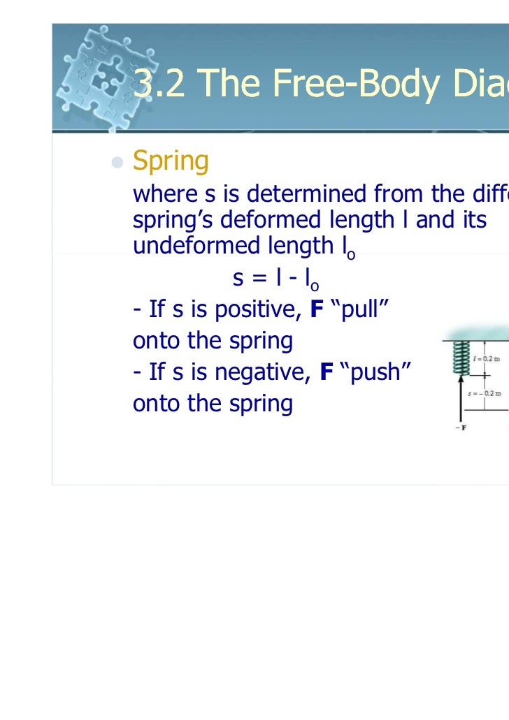 Spring Force F spring: The spring force is the force exerted by a compressed or stretched spring upon any object that is attached to it. An object that compresses or stretches a spring is always acted upon by a force that restores the object to its rest or equilibrium position. ... (or absence) and to construct a free-body diagram that ...