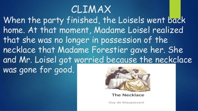 Learn more about The Necklace with a detailed plot summary and plot diagram. The surprise ending forces readers to see the plot as a series of contrasting events. Madame Loisel's one evening of glory living out her fantasies is what knocks the couple down far below what they were before the ball.