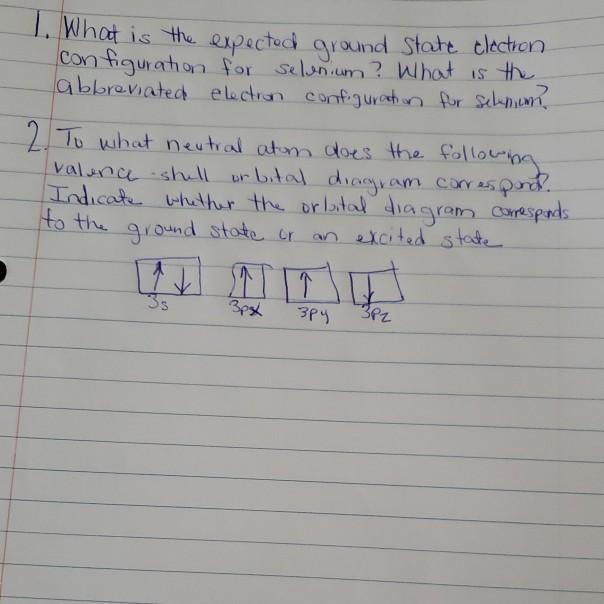 5. 1 The orbital diagram for a ground state nitrogen (7) atom is: A. 2 The orbital diagram for a ground state oxygen (8) atom is: D. 3 The orbital diagram for a ground state carbon (6) atom is: D. 4 Which ground state atom has an electron configuration described by the following orbital diagram? Phosphorus. A step-by-step description of how to write the electron configuration for Selenium (Se) and the Selenium ion (Se2-).In order to write the Se electron configu... In writing an. Answer to orbital diagram for selenium home / study / science / chemistry / chemistry questions and answers / Orbital Diagram For Selenium. here is the electronic configuration. Z=34 so 1s2 2s2 2p6 3s2 3p6 4s2 3d10 4p4.Selenium (Se) has an atomic mass of Find out about its chemical and physical properties, states, energy ...