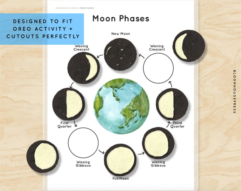Paper plate or the free printable phases of the moon worksheet (fill out the form at the bottom of the post to grab your downloadable file) Instructions: 1. Separate 8 Oreo cookies by slowly twisting the top and bottom cookies. Set the cookies without frosting aside (or eat them!) 2. Use the knife or popsicle stick, carefully scrape off a portion of the frosting to recreate each moon … The Phases of the Moon | Chart. The phases-of-the-moon-diagram depicts the continuous cycle of changes in the illuminated part of the Moon's surface in eight distinct stages. This chart is sure to append to the vocabulary of kids. Label the Phases of the Moon. This label-the-phases-of-the-moon worksheet encapsulates the eight phases of the Moon. The kids of grade 4 and grade … This KS2 Phases of the Moon worksheet is handsomely illustrated and designed to clearly show the relationship between the Moon, Earth and Sun in each of the Moon’s phases. It's ideal for children in Year 5 and is designed to help you set challenging work for mixed-ability classes.Includes:Moon phases worksheets for three levels of ability.The lower ability version …