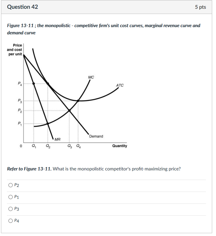 How a Profit-Maximizing Monopoly Decides Price In Step 1, the monopoly chooses the profit-maximizing level of output Q 1, by choosing the quantity where MR = MC. In Step 2, the monopoly decides how much to charge for output level 1 by drawing a line straight up from Q 1 to point R on its perceived demand curve. B) In seeking the profit-maximizing output the pure monopolist underallocates resources to its production. C) The pure monopolist maximizes profits by producing that output at which the differential between price and average cost is the greatest. D) Purely monopolistic sellers earn only normal profits in the long run. 24) Refer to Figure 13-11. What is the monopolistic competitor's profit maximizing price? A) P1 . B) P2 . C) P3 . D) P4 . 25) Refer to Figure 13-11. The firm represented in the diagram . A) should expand its output to take advantage of economies of scale. B) should exit the industry. C) makes zero accounting profit. D) makes zero economic profit. A perfectly competitive firm produces 3,000 units of a good at a total cost of $36,000. The price of each good is $10. Calculate the firm's short run profit or loss. Refer to the diagram to the right which shows the cost and demand curves for a profit-maximizing firm in a perfectly competitive market.