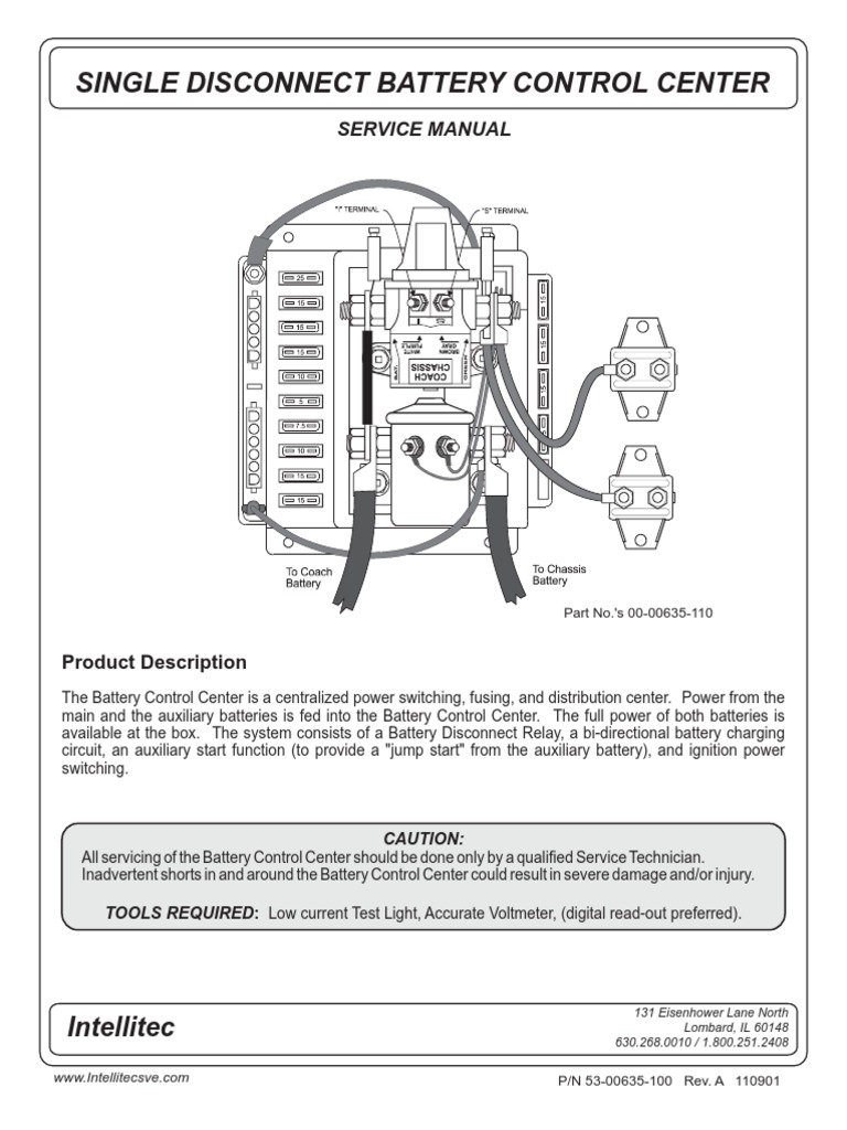 SINGLE DISCONNECT BATTERY CONTROL CENTER. SERVICE MANUAL. Part No.'s 00-00635-110. Product Description The Battery Control Center is a centralized power switching, fusing, and distribution center. Power from the main and the auxiliary batteries is fed into the Battery Control Center. The full power of both batteries is available at the box. The system consists of a Battery Disconnect Relay, a ...
