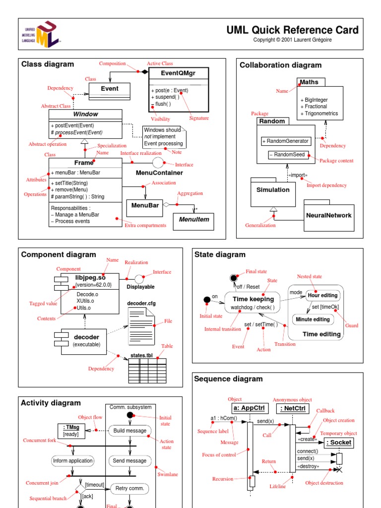 Best UML cheatsheet and UML reference guides Lou Franco UML Cheatsheet. To the point. Example diagrams are annotated with the name of the modeling elements used in the example. Class, use case and sequence diagrams covered UML quick reference card. Another 1-page quick reference, great to be printed and keep close to you.