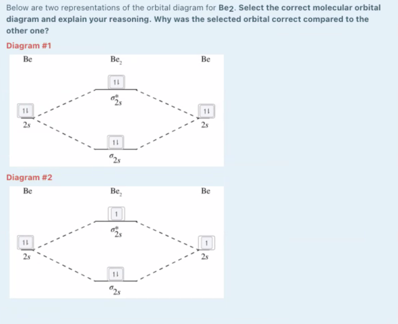 Solved Construct the molecular orbital diagram for Be2 ... Expert Answer 100% (24 ratings) Transcribed image text: Construct the molecular orbital diagram for Be2. Note that the 1s orbitals are not shown. Be Ho Be Answer Bank IL | Identify the bond order. O 0 O os O 1s Previous question Next question