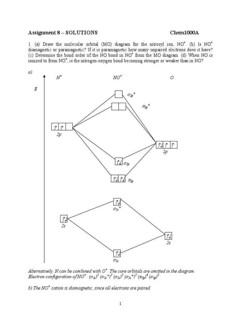 › document › 325957447Solution Manual Brady Chemistry 6TH Edition PDF | PDF | Ion ... The first compound in the diagram has two blue and three red atoms. The second compound has two blue and one red atom. Since each compound has two blue atoms we can compare the ratio of red atoms between the Chapter 1. two compounds. Thus, the ratio of red atoms in the two compounds to two blue atoms in the two compounds, is three to one. 1.19 No Mo Diagram - Lan Diagrams mo diagram no+ cation › no mo energy diagram › no molecule mo diagram. No Mo Diagram Written By admin. Wednesday, April 21, 2021 Edit. No Mo Diagram. In this repository All GitHub ↵. An MO diagram, just like an atomic orbital diagram, shows the relative energy and number of electrons in each MO. bond ... Draw the molecular energy level diagrams of NO+, NO, and NO-. Calculate their bond ... Answer to: Draw the molecular energy level diagrams of NO+, NO, and NO-. Calculate their bond orders and give their magnetism (diamagnetic or... Solved: Draw the molecular orbital diagrams for NO- and NO+. Compa... | Chegg.com Step-by-step solution. Step 1 of 4. Molecular orbitals are formed by linear combination of atomic orbitals. Atomic orbitals and molecular orbitals of a molecule can be shown in a molecular orbital diagram. Chapter 10, Problem 115E is solved.