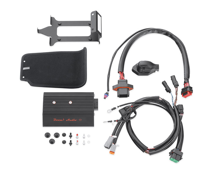 Boom! Audio Stage II Saddlebag Speaker ... - Harley-Davidson Description Kit includes the hardware and wiring harnesses required to install Stage II Saddlebag Speakers and a Boom! ™ Amplifier. • Includes main wiring harness, quick-disconnect saddlebag wiring harnesses, mount and cover for saddlebag-mounted amplifier, and all required hardware