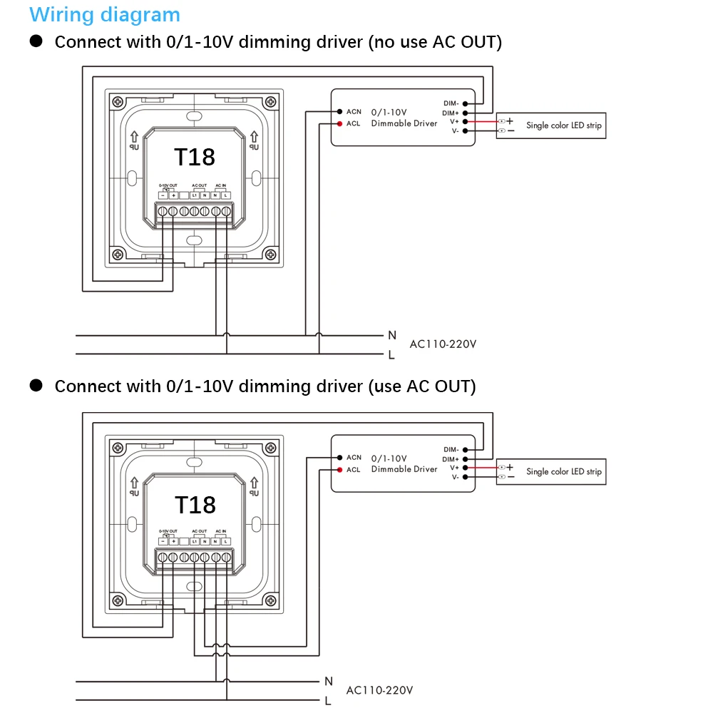 PDF 0/1-10V Constant Voltage LED Dimmer Wiring Diagram Cau se Troubleshooting 1. Reduce cable or loop supply. 2. Change wider wire. 3. Replace higher power supply. 4. Add pow er r p at r. 1. Check the power. 2. Check the connection. Technical Parameters